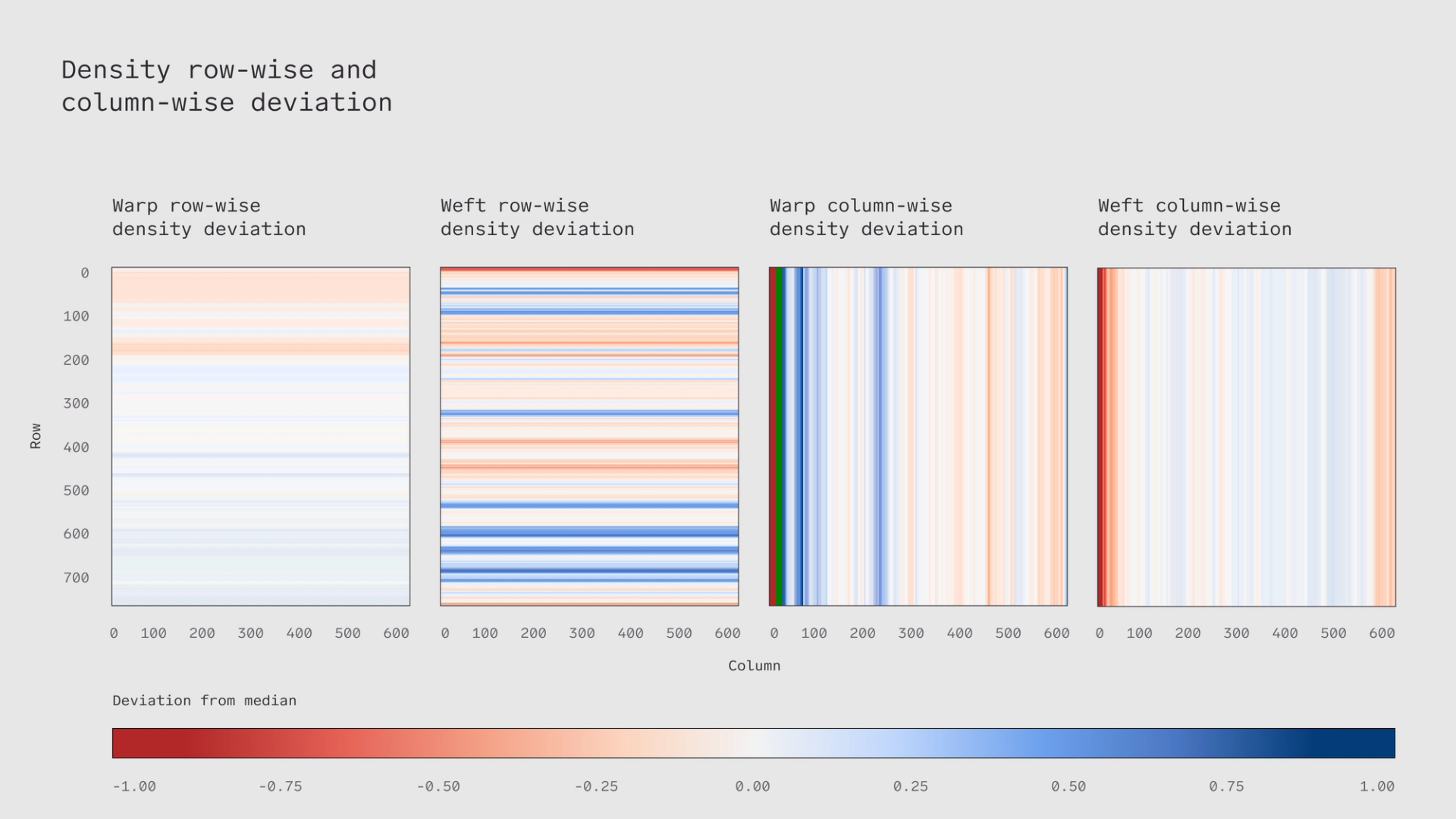 Building on earlier research that uses heat maps to visualize thread density and angle, we have developed this by accumulating values across rows and columns. This method creates an exceedingly detailed and robust thread signature against which to compare and differentiate artworks effectively.