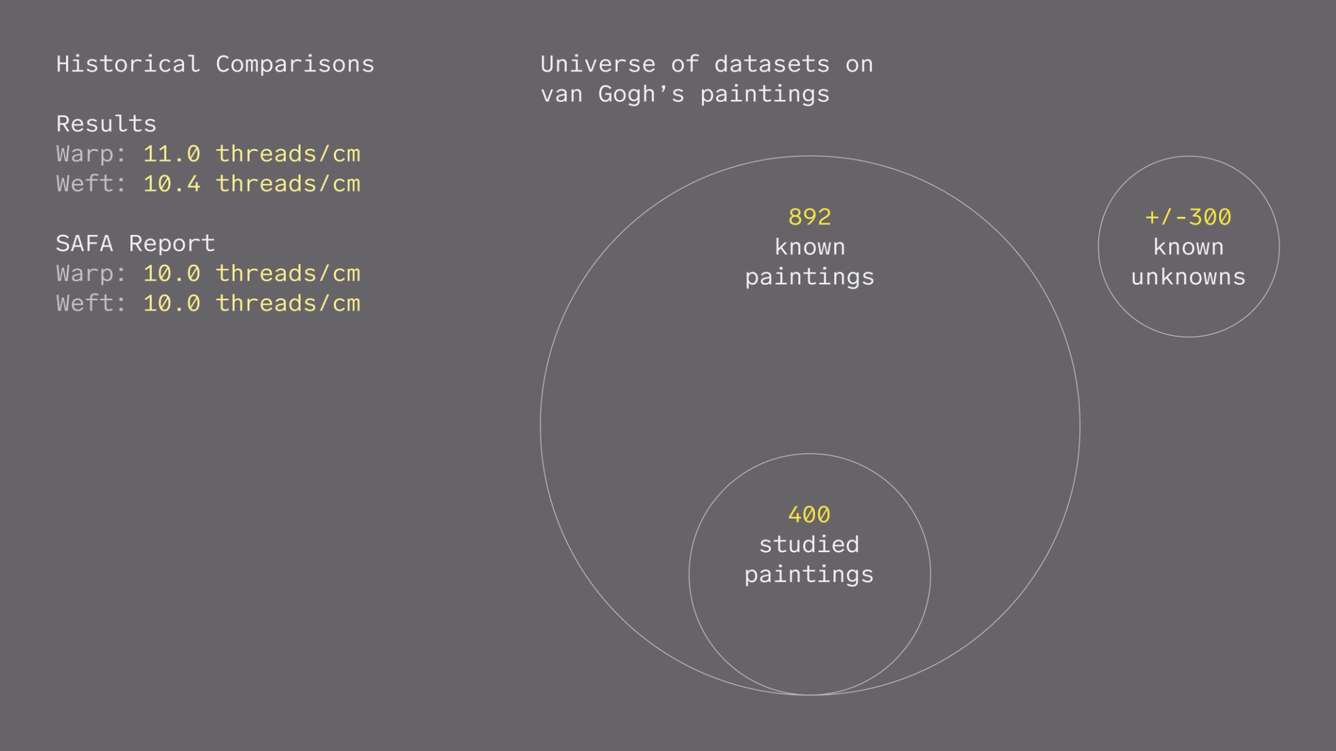 As detailed in the Elimar report, the process and analysis LMI undertook reveals variability and gaps in thread density data for van Gogh paintings, and a lack of comprehensive data makes it difficult to draw definitive conclusions about van Gogh’s canvas and other material practices across his body of work.
